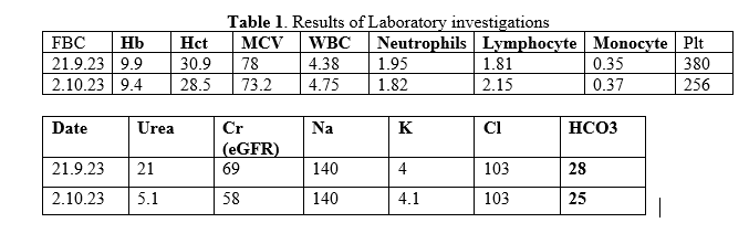 For infection screening, serology for HIV, anti HBs antibody and anti HCV antibody were negative. Widal test was also negative from 1/20 dilution. Stool for AFB was not seen. Stool RE only showed bacterial flora. Thyroid function tests came back as euthyroid.