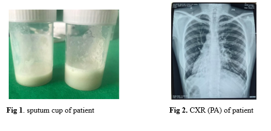 A 25- year- old woman was referred to the Department of Respiratory Medicine for further evaluation of chronic productive cough. On further questioning, she had repeated episodes of productive cough throughout her childhood and teenage years. During the last five years, she felt breathless more pronounced on exertion as well as chest tightness associated with wheezing on some of the days. She also noticed recurrent episodes of stuffy nose, nose block and nasal discharge, dipping along the throat when lying down. She had no fever, allergies, or skin rash. She had stable body weight with normal appetite. One month prior to recent admission, she coughed up mucopurulent sputum of large volume, about 50 to 100 ml per day (Figure 1). She became more breathless than usual and had hemoptysis one week before admission.