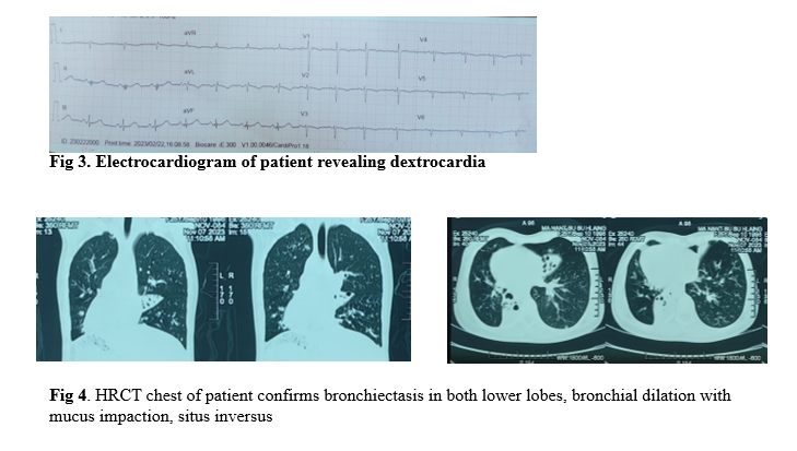 Her initial diagnosis was bronchiectasis exacerbated by lower respiratory tract infection. She was given treatment with empirical IV antibiotics, oxygen therapy, nebulized bronchodilators and mucolytics. Electrocardiogram showed inverted P waves in lead I, right axis deviation and QRS com¬plexes get progressively smaller in leads V 1–V 6 (Figure 3). Ultrasound examination of the abdomen had a normal liver and gall bladder on the left side and a normal spleen on the right side. On further investigations, HRCT chest confirmed bronchiectasis in both lower lobes and situs inversus totalis. There was atelectasis with mucus plugging in lingular segment of right upper lobe and left middle lobe. (figure 4). On reviewing the previous available records, findings of dextrocardia and situs inversus were not noted down.