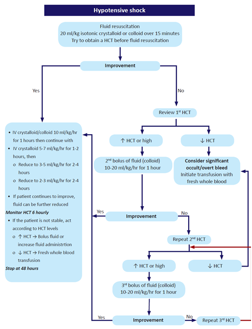 - All patients with dengue shock should be managed in high dependency / intensive care units. Fluid resuscitation must be initiated promptly. (figure 1)