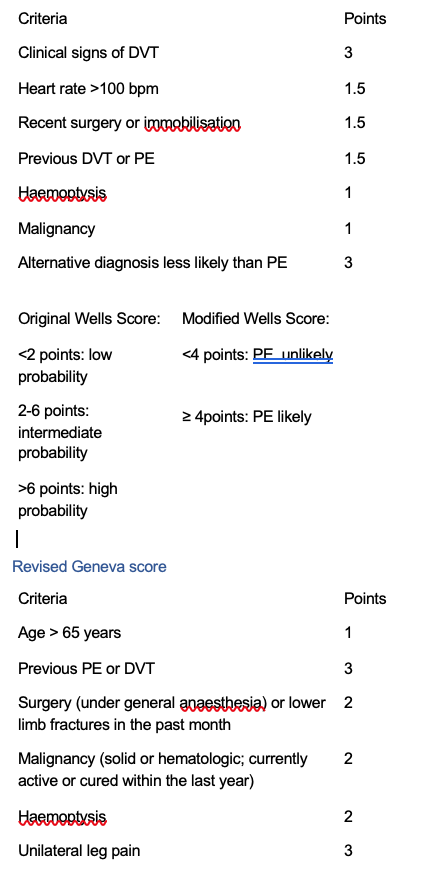 Modified/Simplified Wells – total score <4 “PE unlikely” and,4 or above “PE likely” Revised Geneva score- total score 0-3 “low probability”, 4-10 “intermediate probability” and 11 and above “high probability”