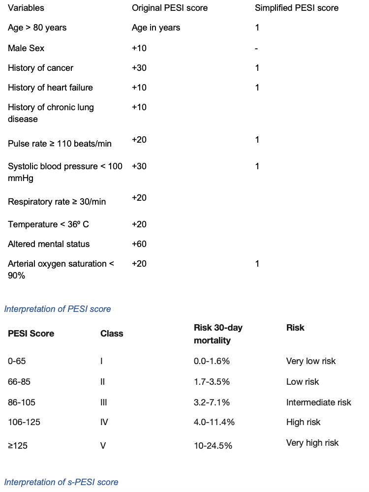 Pulmonary embolism severity index (PESI) and simplified PESI