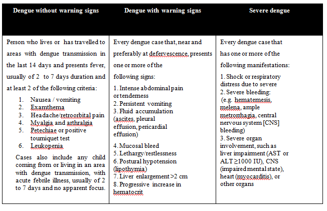 Clinical criteria that define DF include a 2-7 day illness with high fever, headache, retro-orbital pain, myalgia, arthralgia/bone pain, rash and haemorrhagic manifestations (positive tourniquet test or petechiae) with no evidence of plasma leakage(2).