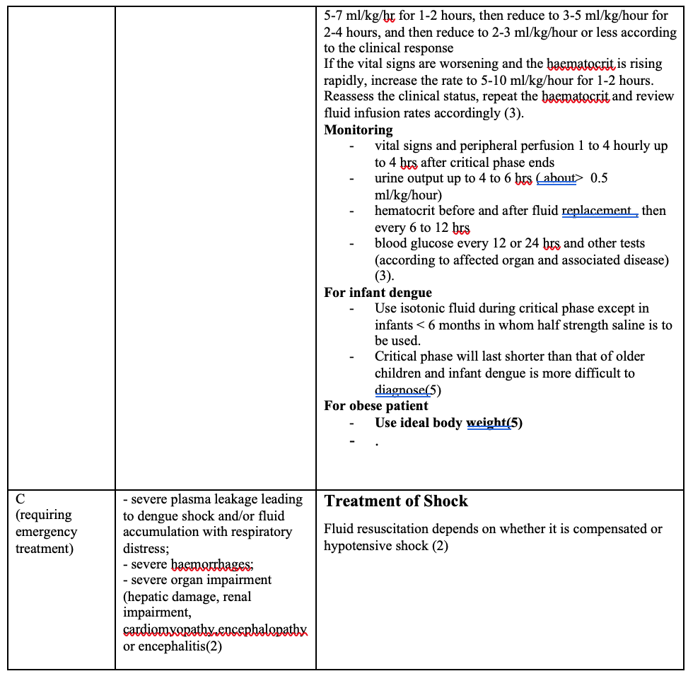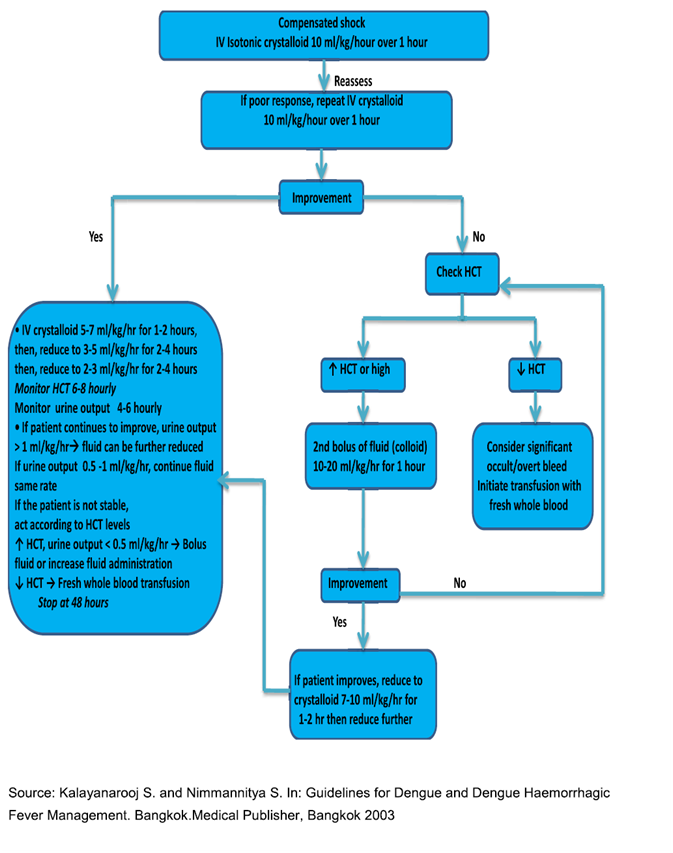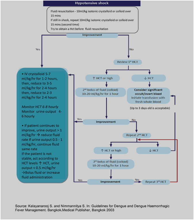 Pearls 7: The physician should be alert to the onset of this unique syndrome of dengue vasculopathy that causes plasma leakage and hypovolaemic shock when the fever subsides. Monitoring should be focused on manifestations of plasma leakage, bleeding and shock. The trend of haematocrit level together with haemodynamic status is the main guide to fluid management.