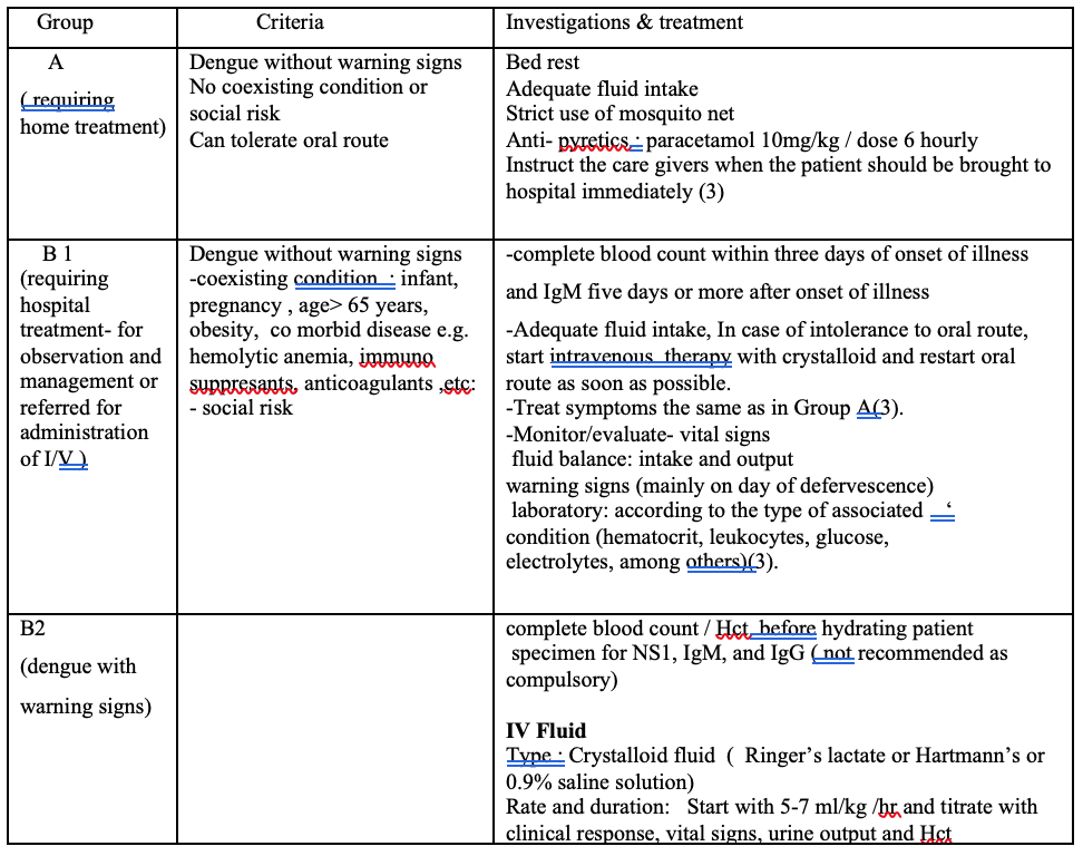 Overall assessments include taking proper history, physical examination and laboratory investigations to get the clinical diagnosis of dengue and to exclude other differential diagnosis. Fever with a potential dengue diagnosis should get the following laboratory tests except in cases with uncommon manifestations (2).