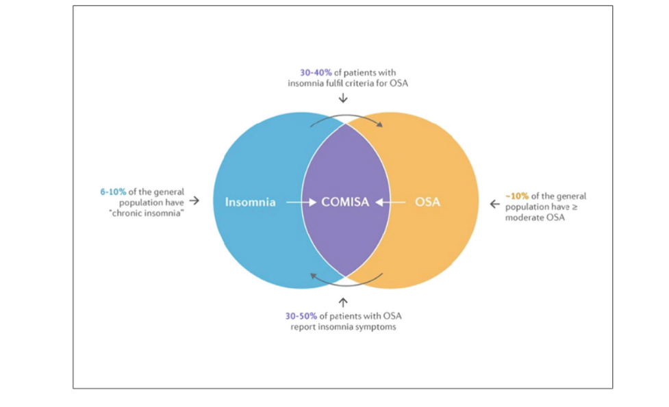 Fig 2. Co-morbid insomnia and sleep apnea (COMISA) is prevalent in 30%-40% of patients with insomnia, and 30%-50% of patients with obstructive sleep apnea (OSA). Figure adapted with permission from Sweetman et al.