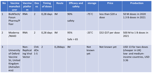 None of the vaccines at the present moment have completed the phase 3 trials. However, with the urgent requirement to control the pandemics, the foremost vaccines have applied for Emergency use listing and plan to roll out in the coming few weeks.5 Some are already used in parts of their own population and some part of the world after applying for EUL in local regulatory authorities. The m RNA based vaccines which have the highest technological innovation are likely to be safest, but as they require to be stored in -70 C(Pfizer), -20C (Moderna), which will be a disadvantage for lower income countries where ultra-low cold chain facilities are lacking. In addition, some of the manufacturers are not enrolled in the COVAX facility. Oxford/ Astra Zeneca, an adenovirus vector based vaccine, has an advantage of requiring usual cold chain system. It is already enrolled to the COVAX facility and likely to be cheaper in cost. The efficacy of this vaccine according to interim analysis is 70% to 90 % lower than Pfizer, Moderna and Sinovac which claimed to have more than 90 % efficacy. As the duration of vaccines development process is less than one year, there is no data on long term efficacy of any vaccine at the present moment.11-14