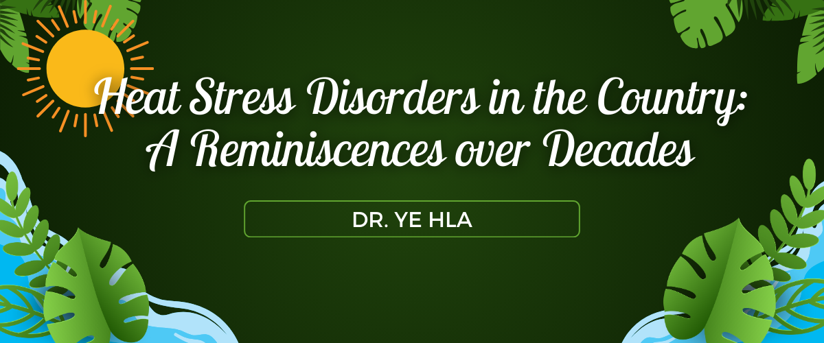 Reminiscence and review of heat stress disorders in the country was made for the heat waves during past decades and up to the present. Standard reference of the book, The Public Health Consequences of Disasters” published by CDC USA was referred which describes the heat waves in the past decades in States, and Europe. Recent observations in hospitalized patients in Yangon and Mandalay hospitals are reviewed and updates on clinical presentations, risk groups or risk factors, laboratory and other investigations’ results which gave more scientific information which served as the background for the media or public education message for prevention of heat strokes especially in dry zones and elsewhere, as no other areas are immune. Standard treatment protocol should be made for rapid cooling and replacement of water and electrolytes. Case definition be made for epidemiological and research studies which should be further carried out, at least core temperature for a heat stroke patient.