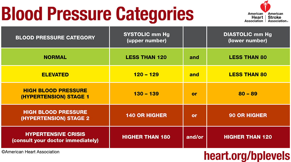 In 2017, the American Heart Association, the American College of Cardiology, and nine other health organizations lowered the numbers for the diagnosis of hypertension to 130/80 mm Hg and higher for all adults. The previous guidelines set the threshold at 140/90 mm Hg for people younger than age 65 and 150/80 Hg for those ages 65 and older