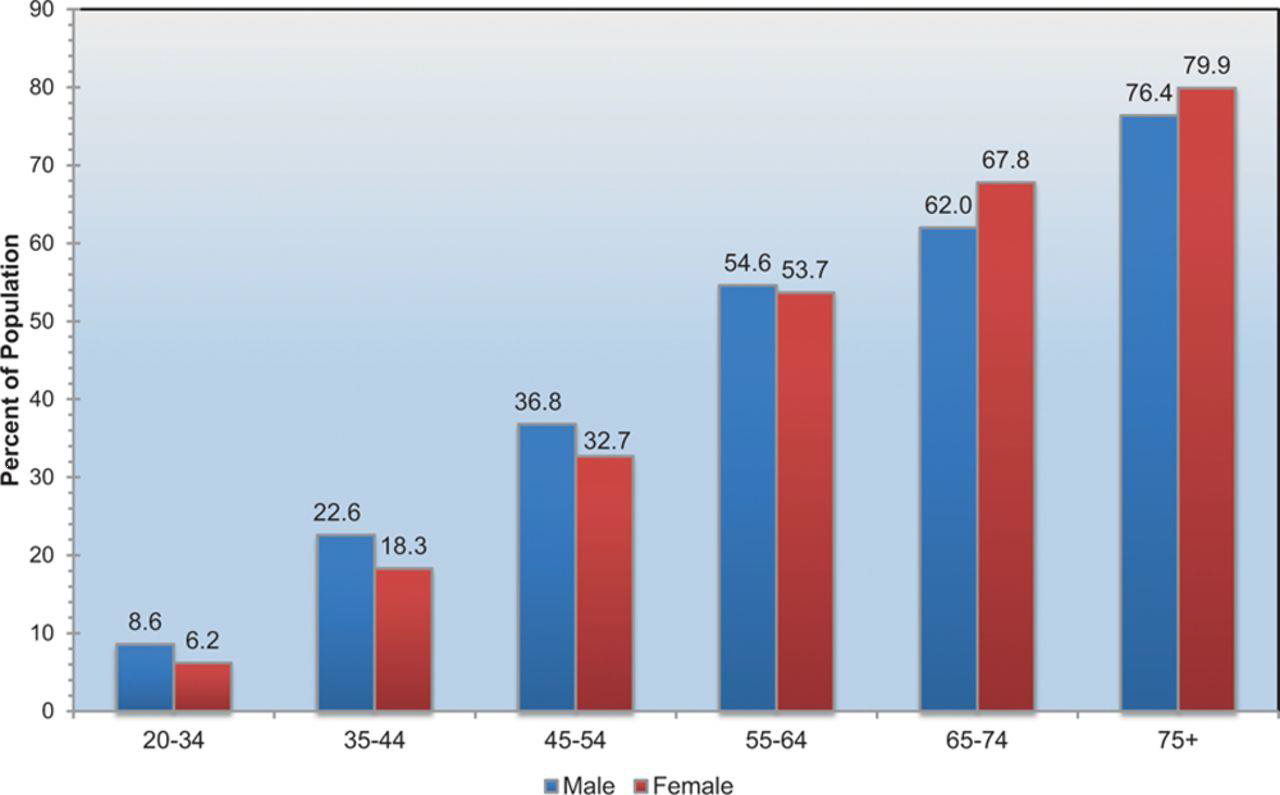 Fig .1- High blood pressure prevalence in adults 20 years and above stratified for age and sex, 2007-2012 (American Heart Association)