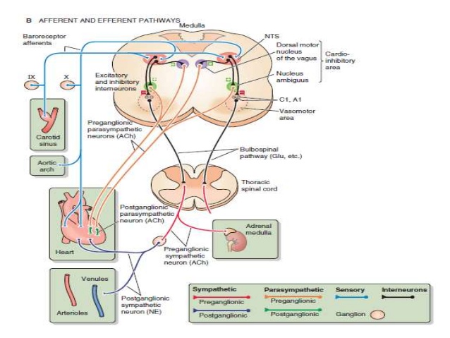 The baroreceptors present in the aortic and carotid sinus are responsive to stretch .They are stimulated when blood pressure rises, and stimulates (a) the inhibitory neurone and (b) dorsal motor nucleus of the vagus in the vasomotor centre. The inhibitory neurone inhibits discharge of the descending neurone which stimulates the sympathetic neurones, switching off sympathetic discharge. At the same time, the vagus is activated to exert negative inotropic & chronotropic effects on the heart. When blood pressure falls, the discharge from the baroreceptors fall, and the inhibition of the sympathetic system is removed, thus: switching on” the effects of sympathetic stimulation. The peripheral chemoreceptors also send impulses to the vasomotor centre and activate sympathetic discharge.