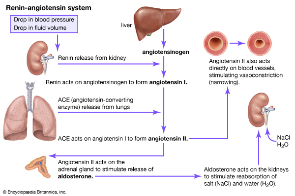 The renin -angiotensin system (RAS) is central to the long-term regulation of blood pressure. A fall in blood volume or blood pressure stimulates the juxtaglomerular apparatus in the kidneys to release renin which acts on angiotensinogen, an alpha2 globulin produced by the liver, to form angiotensin I. Angiotensin I (ANG I) is cleaved into angiotensin II (ANG II) by the angiotensin converting enzyme (ACE) present in the lungs. ANG II is the most potent circulating vasoconstrictor identified. It also stimulates aldosterone release from the adrenal cortex, promoting water and sodium retention, increase in blood volume, venous return, stroke volume and cardiac output.
