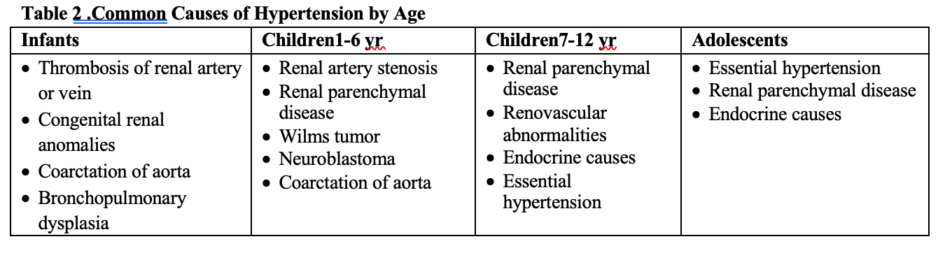Hypertension can be primary (i.e, “essential”) or “secondary”. In general, the younger the child and the higher the blood pressure, the greater the likelihood that hypertension is secondary to an identifiable cause. A secondary cause of hypertension is most likely to be found before puberty. After puberty, hypertension is likely to be essential.