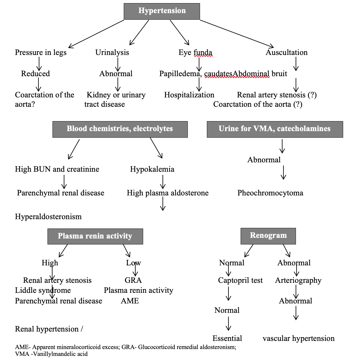 Findings from the patient’s history and physical examination dictate the appropriate choice of tests. The complete blood cell (CBC) count may indicate anaemia due to chronic renal disease. Blood chemistry studies may be helpful. An increased serum creatinine concentration indicates renal disease. Hypokalemia suggests hyperaldosteronism.. High plasma renin activity indicates renal vascular hypertension, including coarctation of the aorta, whereas low activity indicates glucocorticoid-remediable aldosteronism, Liddle syndrome, or apparent mineralocorticoid excess. A high plasma aldosterone concentration is diagnostic of hyperaldosteronism. High values of catecholamines (eg, epinephrine, norepinephrine, or dopamine) are diagnostic of pheochromocytoma or neuroblastoma.