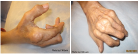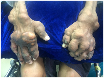 Fig 2: Images of chronic tophaceous gout minicking RA