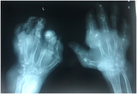 Fig 4: Images of an x ray on hands of severe chronic tophaceous gout