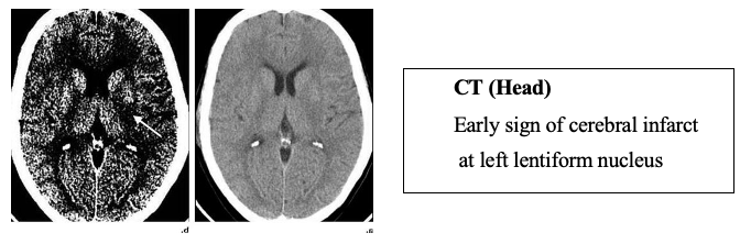 A 54 year old right handed lady presented with sudden onset of right hemiparesis and slurred speech 1 hour ago. She did not have any medical checkup previously. On examination, GCS was 15/15, right facial palsy (UMN), slurred speech, right hemiparesis (power 3/5), up going planter response on right side. NIHSS score was 12. Blood pressure was 180/110 mmHg, pulse was 84/min, heart and lungs were unremarkable. Complete blood picture, urea and electrolytes, creatinine and coagulation profiles were normal.