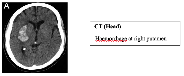 On examination, GCS was 15/15, pupil was 2 mm, equal with good light response. There was left facial palsy (UMN) and left hemiparesis.
