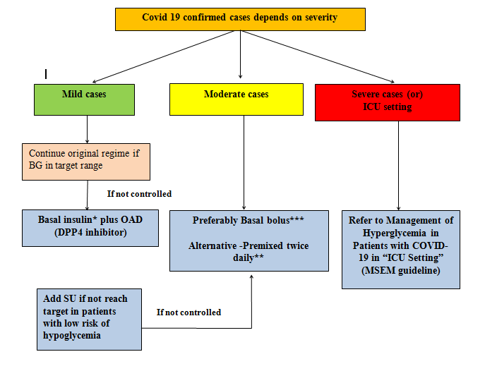 Severe or critically ill COVID-19 case- IV insulin infusion therapy may be preferred treatment to combat severe hyperglycemia and cytokine storms. (Refer to MSEM guideline of management of DM with COVID-19 2020)