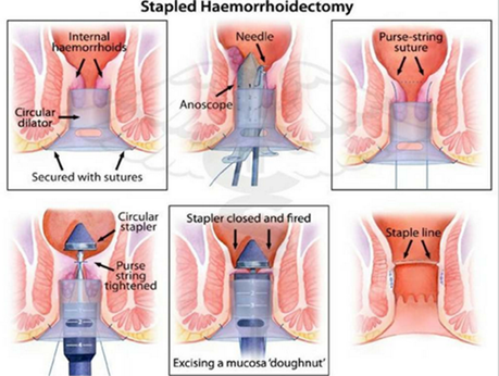 In 2001, an expert panel came up with the official term Stapled Haemorrhoidopexy28. With this procedure, prolapsing haemorrhoidal tissue is resuspended back into the anal canal. The haemorrhoids are not removed, but repositioned in their anatomic location. This is done with a 33 mm stapling gun which performs a circumferential resection of mucosa and sub-mucosa above the haemorrhoids and then, staples closed the defect13.