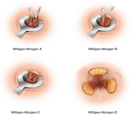 L&E (Ligation and Excision) is called Milligan-Morgan Method (Figure 3). This is the gold standard up to now. The procedure is performed under general anesthesia or regional anesthesia with the patient in the lithotomy position. Each haemorrhoidal mass is excised from the underlying sphincter muscle and the pedicle is transfixed suture, tied. The wound is left open and healed by secondary union. The raw wound healed in four to eight weeks14, 15, 16.