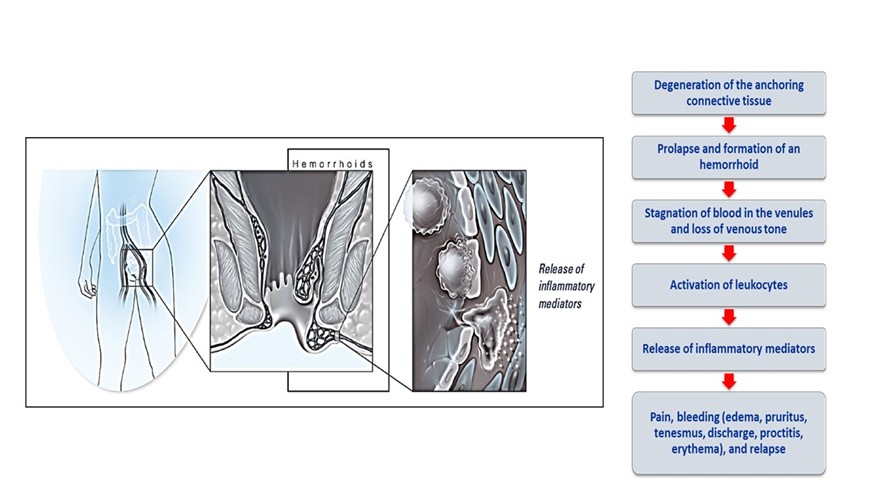 Patients should be educated not to spend long periods of time reading on the toilet bowl. Symptoms may resolve sometimes by just simply changing the bowel habit. Many topical agents, suppositories and creams are available to alleviate pain, irritation and pruritus. Most are of marginal if any benefit. Oral venotonics, such as MPFF (micronized, purified, flavonoid, fraction) have been used in the treatment of haemorrhoidal disease. The rationale of flavornoids in haemorrhoidal disease is its unique mode of action and the mechanism of action on the sequence of changes in haemorrhoidal disease (as shown in the diagram).