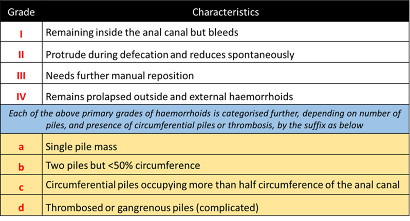 A new classification has been proposed by the Association of Surgeons of India, to further elaborate the clinical varieties of haemorrhoidal disease (Table 1).
