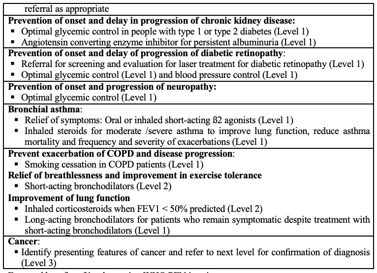 A minimum set of intervention is defined in the WHO Package of Essential NCD (WHO PEN) interventions. Interventions selected are those that are feasible for implementation even in low-resource settings with a modest increase in investment. They can be delivered by primary care physicians or general practitioners and basic health workers in primary care. The interventions include detection, prevention, treatment and care of CVD and risk factors (heart disease, stroke, hypertension), diabetes, chronic respiratory disease (asthma and COPD) and cancer. The aim of such a package is to provide an equitable framework for starting work to scale-up primary care as country strive to achieve universal access in the health sector.