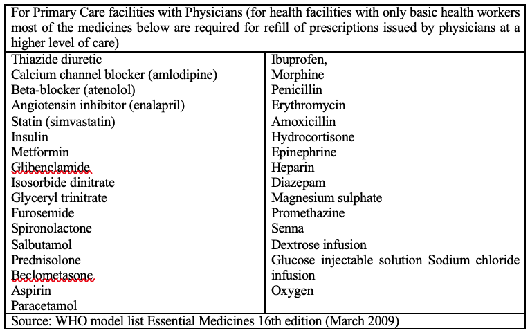 Evidence indicates that affordable and effective medicines for NCDs are unavailable in many countries and, in a few instances when they are available, they are largely unaffordable or of poor quality. The attendant out-of-pocket expenditures for essential medicines may discourage appropriate use of medicines, and generally reduce the potential for adherence to treatment. A core set of essential medicines need to be made available (Table 3).