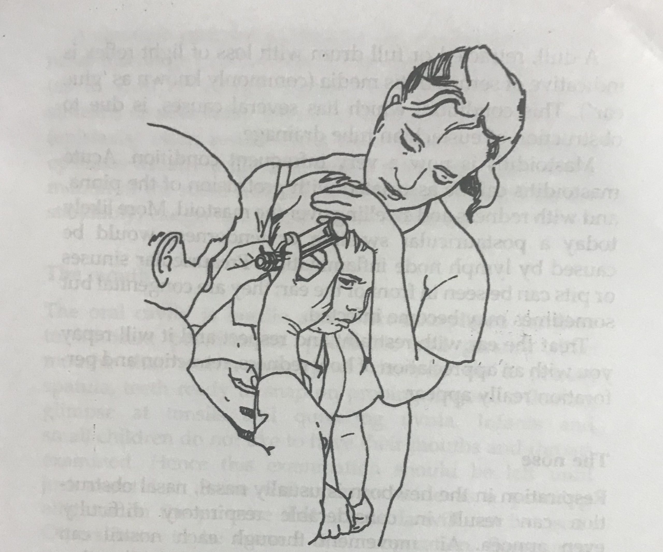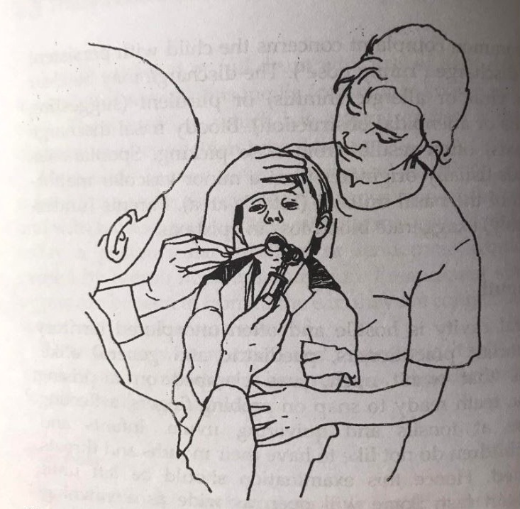 The doctor should leave the strange or unpleasant procedure to the last part of the examination. Examples of these procedures include blood pressure measurement, throat examination, otoscopic examination and opthalmoscopic examination. Proper holding of the child by mother or caretaker is required for the success of these procedures and the doctor or nurses have to instruct them properly.( Photo–12,13)