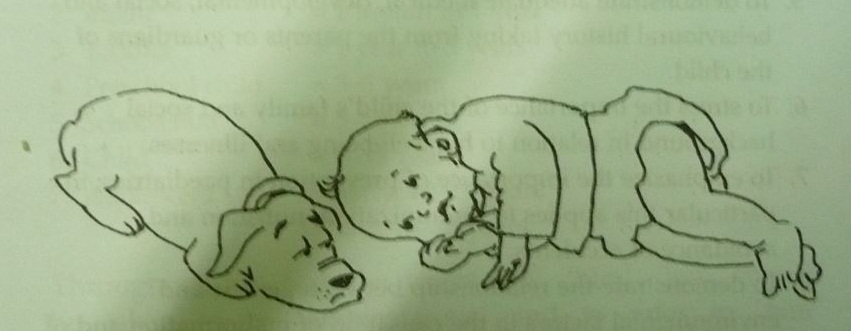 b. Stop – The first rules in approaching any child are very similar to those for crossing the road – stop, listen, look and use your other senses. The first approach is a hands-off one- stop. Allow the child to look at you and, insofar as he can, decide you are a person to be trusted. Let him look at you as you talk to the mother. Take your time, make no sudden moves (for you may frighten a fretful toddler) and be in no hurry to examine the child. Even better, let him play in your presence. Approach cautiously, be nice, utter reassuring sounds like brave boy, clever girl etc. (Photo -5)