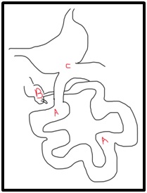 Fig 2– Diagram showing the intraoperative findings; A – dilated jejunum and ileum, B – high-riding caecum, C – previous gastro-jejunostomy