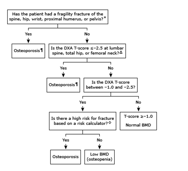 Osteoporosis may be diagnosed based on history of fragility fracture, BMD, or calculated 10-year fracture risk.