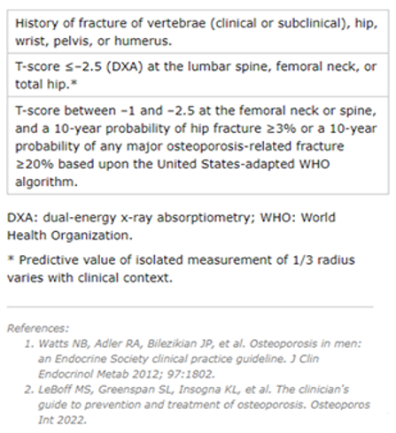 - LeBoff MS, Greenspan SL, Insogna KL, Lewiecki EM, Saag KG, Singer AJ, Siris ES; 2022. The clinician’s guide to prevention and treatment of osteoporosis. Osteoporos Int.;33(10):2049. Epub 2022 Apr 28.