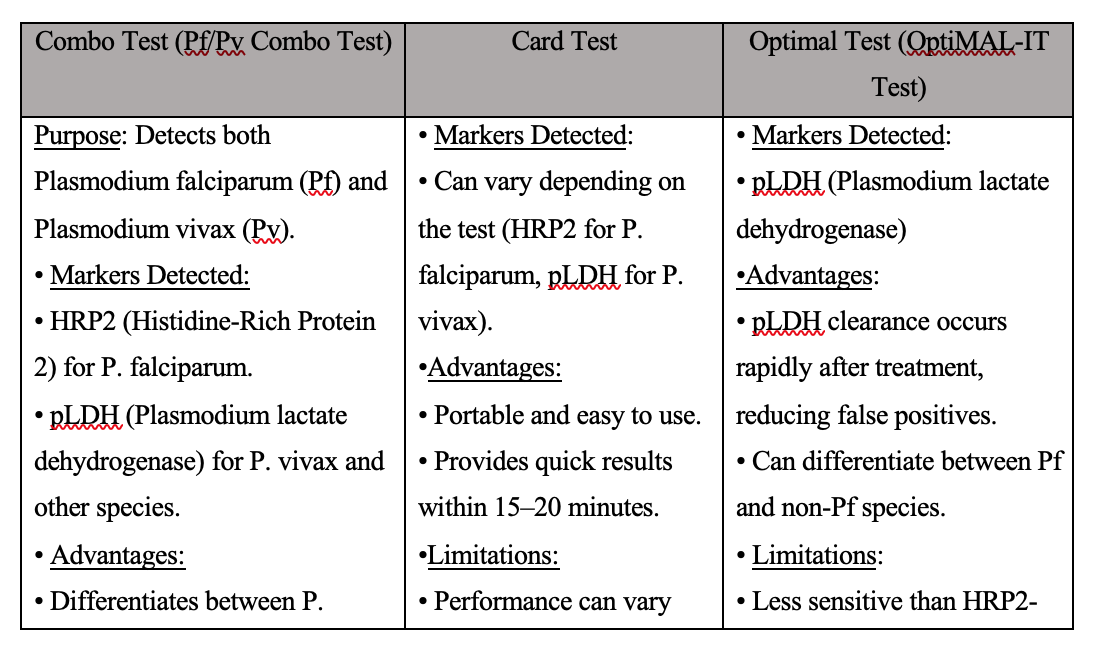 1. Persistent HRP2 Antigen (Histidine-Rich Protein 2) Detection• Most Pf RDTs detect the HRP2 antigen, which can remain in the bloodstream for weeks to months after successful treatment, even in the absence of active infection• The antigen clearance rate varies among individuals but can persist for up to 5–6 weeks, leading to false-positive results.