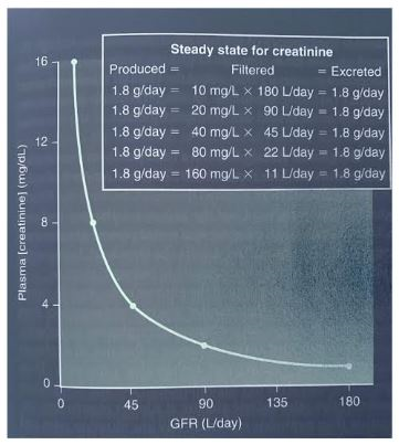 Fig 3. The inverse relationship between plasma creatinine concentration and the glomerular filtration rate (GFR). If GFR is decreased by half, plasma creatinine concentration is doubled when the production and excretion of creatinine are in balance in a new steady state.
