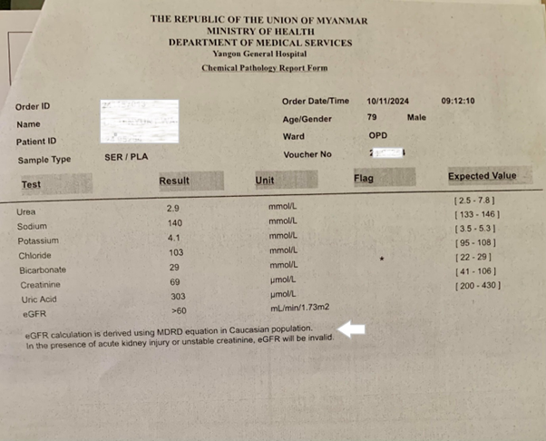 Fig 4. A laboratory report on serum urea and electrolytes. Note the statement indicated by the white arrow: eGFR calculation is derived using MDRD equation in Caucasian population. In the presence of acute kidney injury or unstable creatinine, eGFR will be invalid.