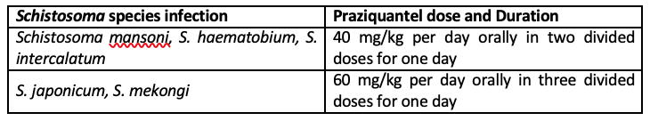 Infections with all major Schistosoma species can be treated with praziquantel. The timing of treatment is important since praziquantel is most effective against the adult wormand requires the presence of a mature antibody response to the parasite. For travelers, treatment should be at least 6-8 weeks after last exposure to potentially contaminate freshwater. One study has suggested an effect of praziquantel on schistosome eggs lodged in tissues. Limited evidence of parasite resistance to praziquantel has been reported based on low cure rates in recently exposed or heavily infected populations; however, widespread clinical resistance has not occurred. Thus, praziquantel remains the drug of choice for treatment of schistosomiasis. Host immune response differences may impact individual response to treatment with praziquantel. Although a single course of treatment is usually curative, the immune response in lightly infected patients may be less robust, and repeat treatment may be needed after 2 to 4 weeks to increase effectiveness. If the pre-treatment stool or urine examination was positive for schistosome eggs, follow up examination at 1 to 2 months post-treatment is suggested to help confirm successful cure.