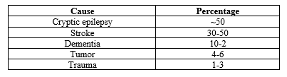The most common cause of epilepsy in the elderly is cryptogenic or stroke-related seizure, followed by dementia and tumors (Table 1).